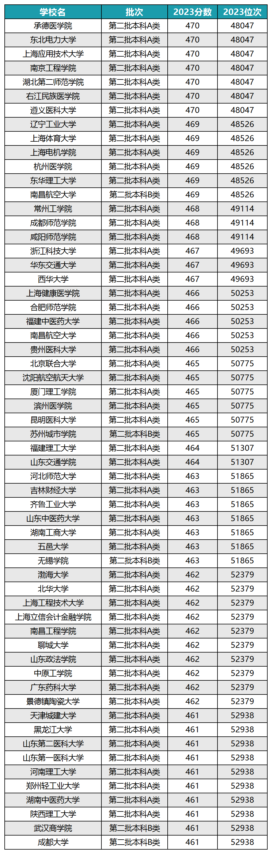 在理科录取中,一共有52所公办本科学校的分数线在430-470分之间,这些学校均为本科二批次招生。