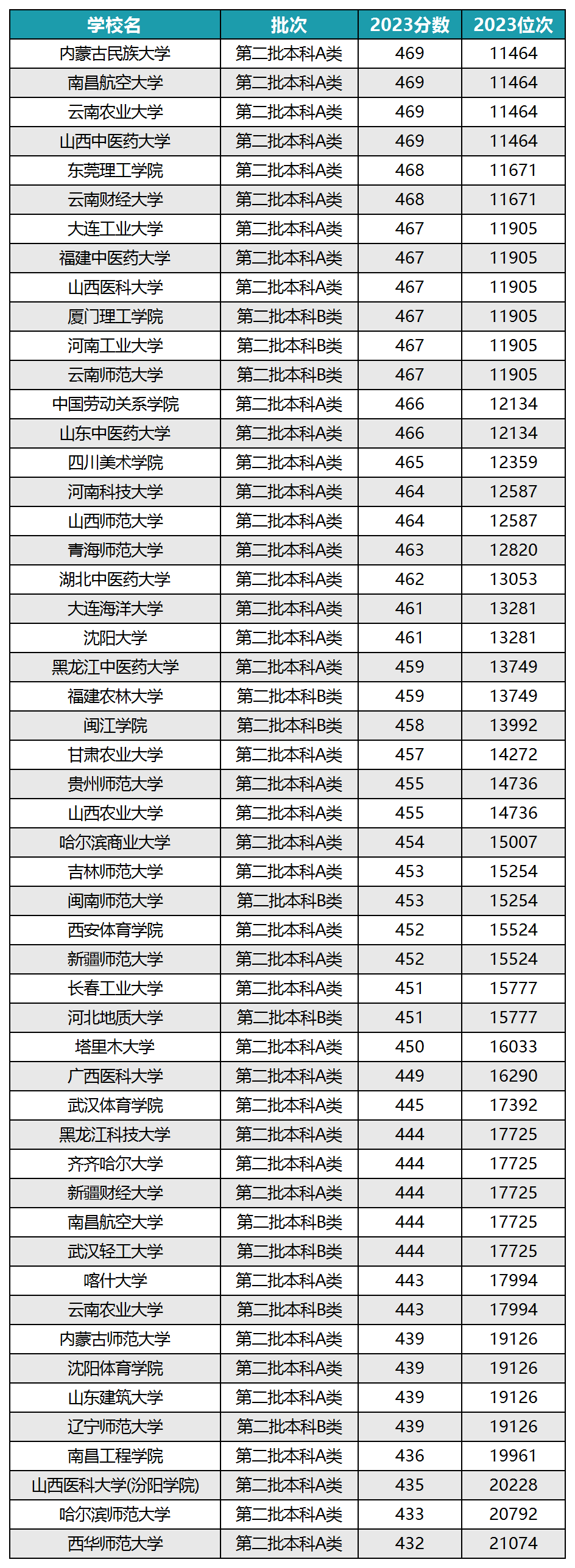 不过不同省份的大学录取分数线各有不同,本文整理了2023年四川省、安徽省430分到470分的二本公办大学名单,可供2024年的高考生查阅。