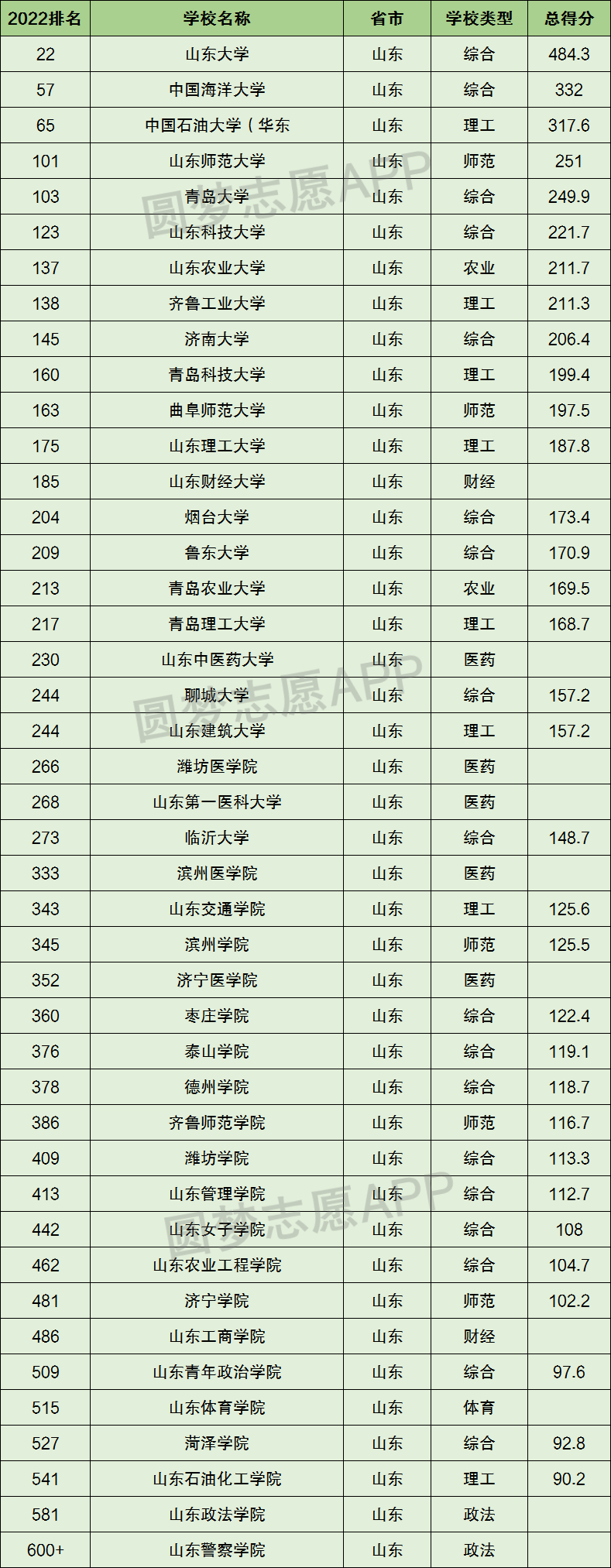 根据2022年软科排名,山东排名前十名大学为山东大学、中国海洋大学、中国石油大学(华东)、山东师范大学、青岛大学、山东科技大学、山东农业大学、齐鲁工业大学、济南大学、青岛科技大学。