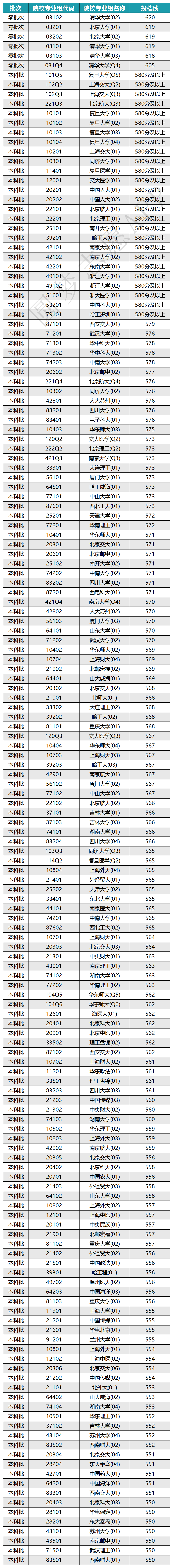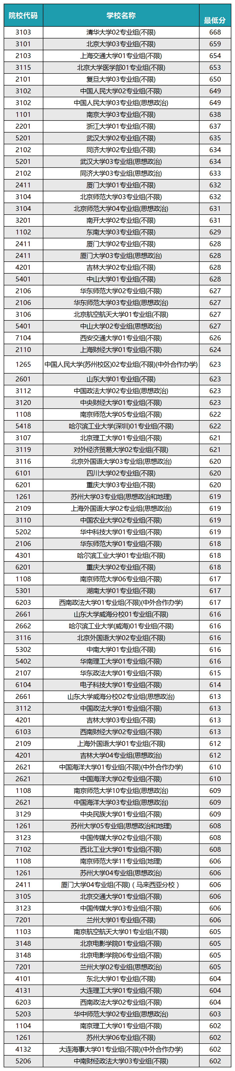 在上海零批次录取中,清华大学和北京大学的录取分数线如下:清华大学(02)组620分、(01)组619分、(03)组618分、(Q4)组605分,北京大学(01)组619分、(02)组619分。