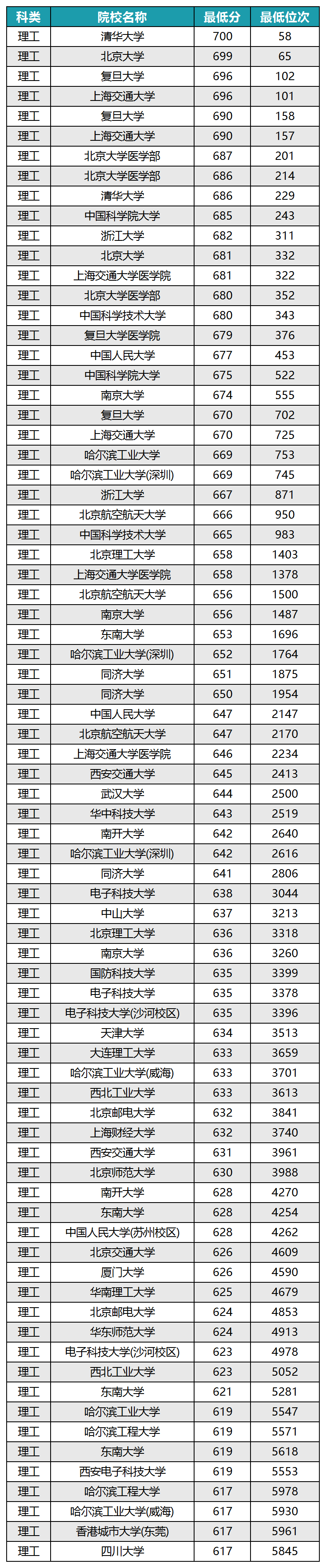 同时,在这50所录取分数线最高的本科大学中,陕西省内最难考的三所大学分别是西安交通大学645分、西北工业大学633分、西安电子科技大学619分。