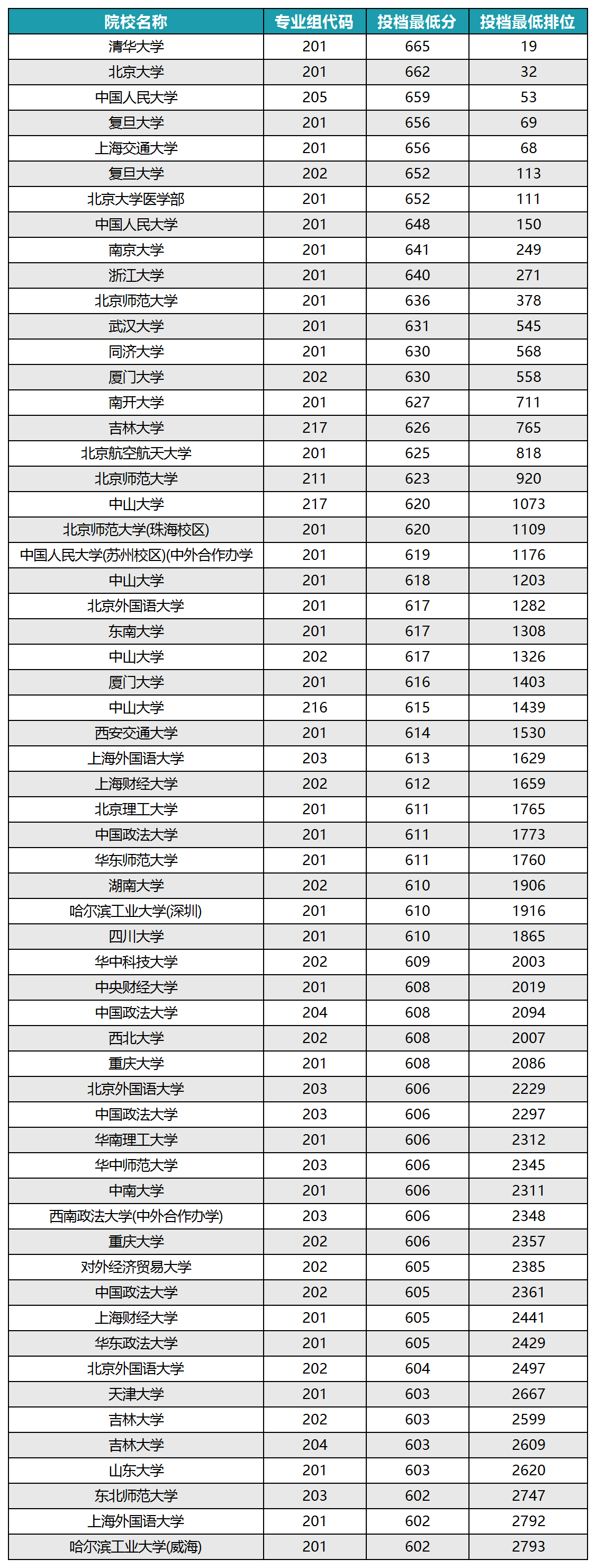 2024年广东历史类本科录取分数线最高的500所大学中,各所大学的分数线均在600分以上。其中,清华大学201组最高,分数线达到655分,2024年投档最低排位为19,是最难考的一所高校;北京大学201组分数线为662分,2024年投档最低排位为32;中国人民大学205组分数线为659分,2024年投档最低排位为53。