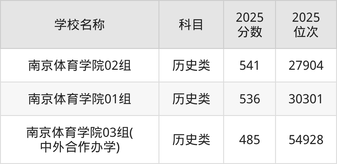 下文为2025年南京市体育类大学在江苏历史类录取分数线和位次排名表,供大家参考: