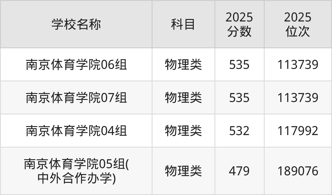 下文为2025年南京市体育类大学在江苏物理类录取分数线和位次排名表,供大家参考: