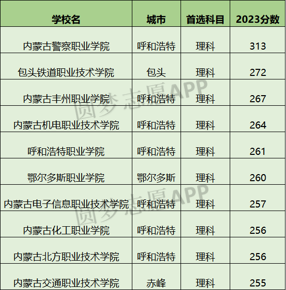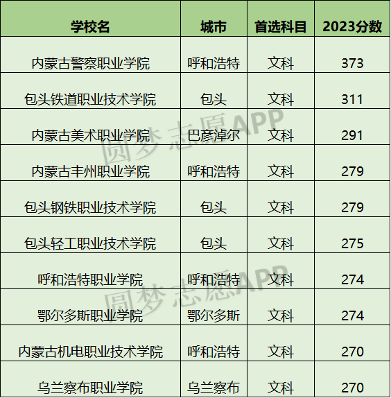 5、呼和浩特职业学院: 2023年文科最低分数线为274分,理科最低261分。