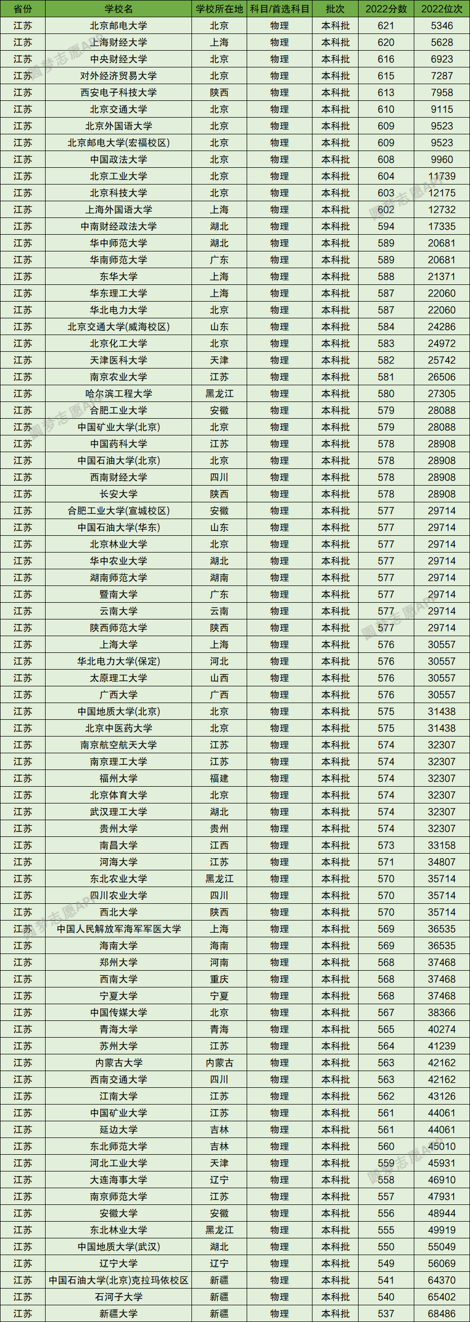 物理类收分最低的是新疆大学,其2022年最低分为537分(超江苏物理类本科线108分),录取位次为68486位。