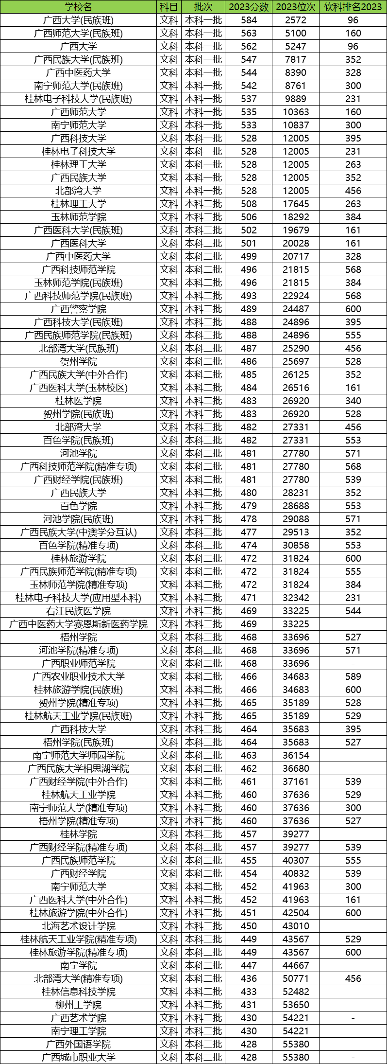 下表为2023年广西壮族自治区内本科大学的文科分数线