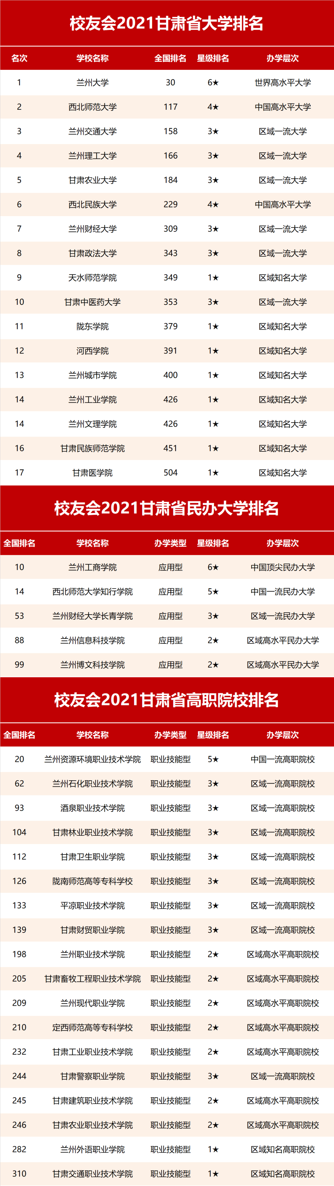 在最新2021中国西北地区大学排名中,兰州大学、西北师范大学、兰州交通大学、兰州理工大学、甘肃农业大学雄居校友会2021甘肃省大学排名前5强。兰州工商学院、西北师范大学知行学院、兰州财经大学长青学院名列2021甘肃省民办大学排名前3强,兰州资源环境职业技术学院、兰州石化职业技术学院、酒泉职业技术学院名列2021甘肃省高职院校排名前3甲。