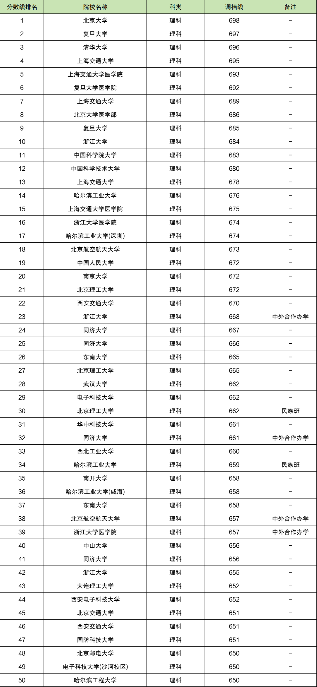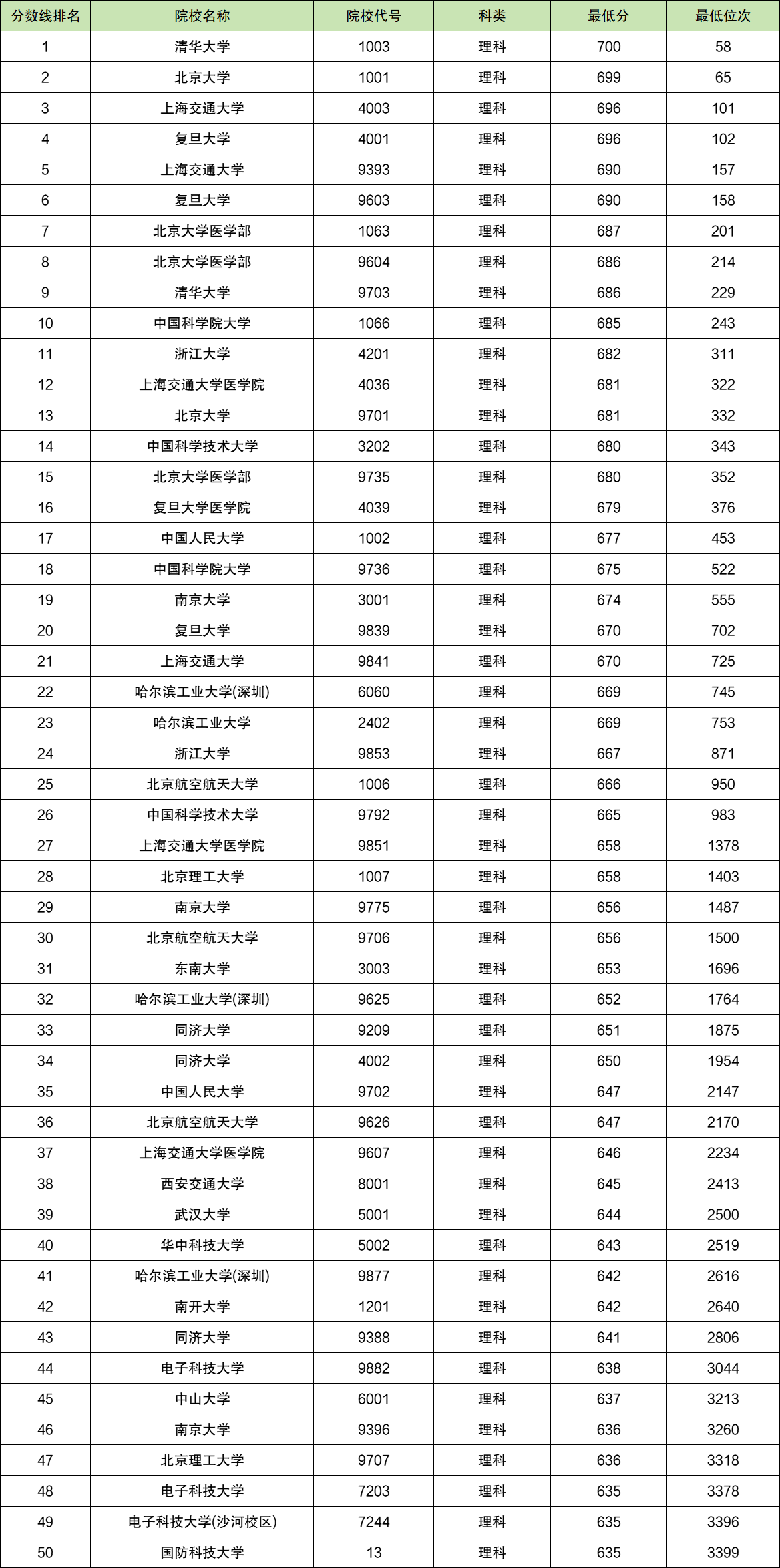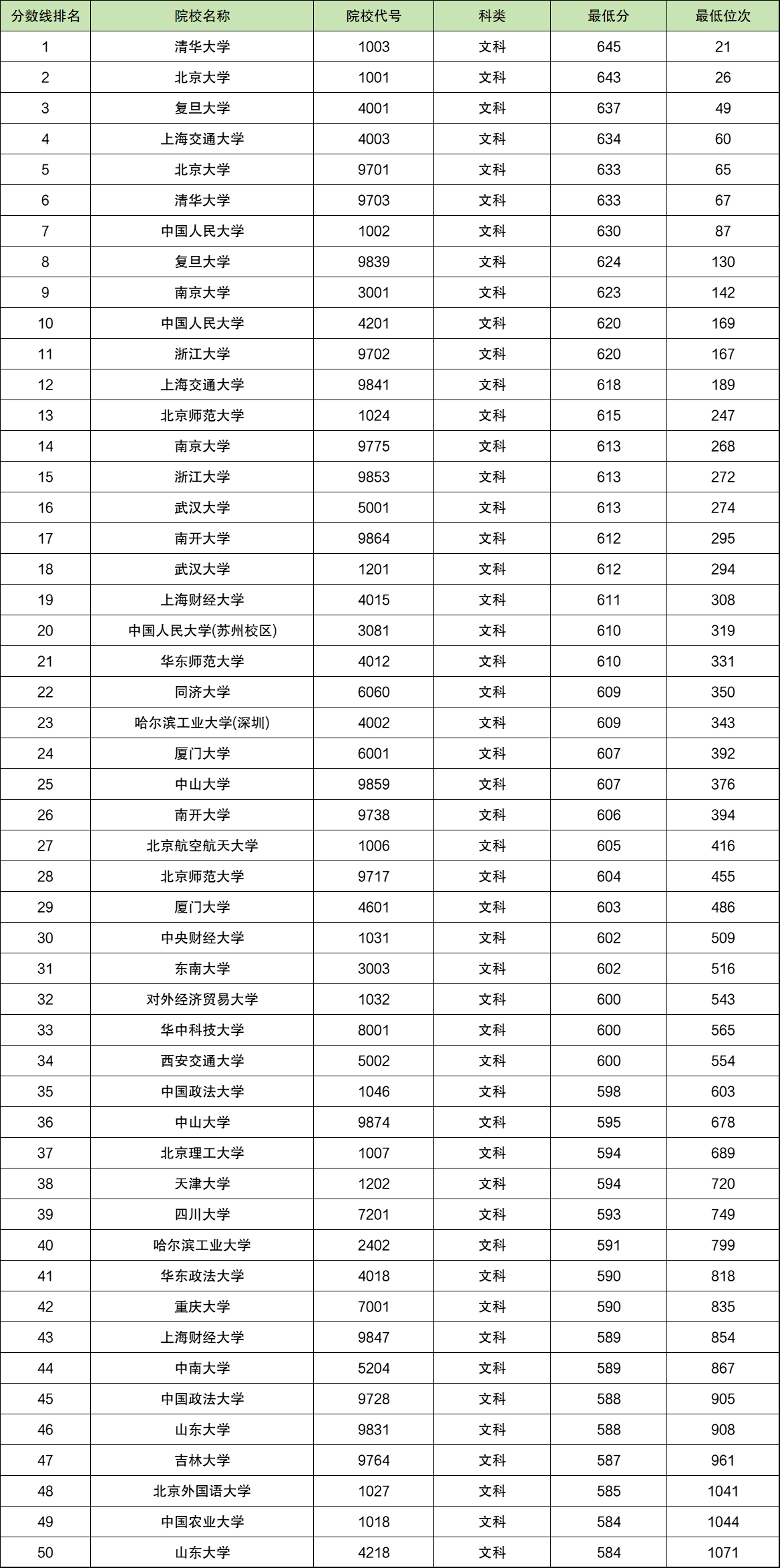 注:由于篇幅限制,本文只整理出排名前50强的院校名单,同分数院校会根据位次和院校名称进行排序。