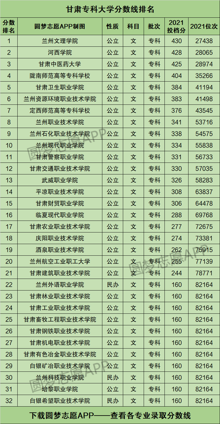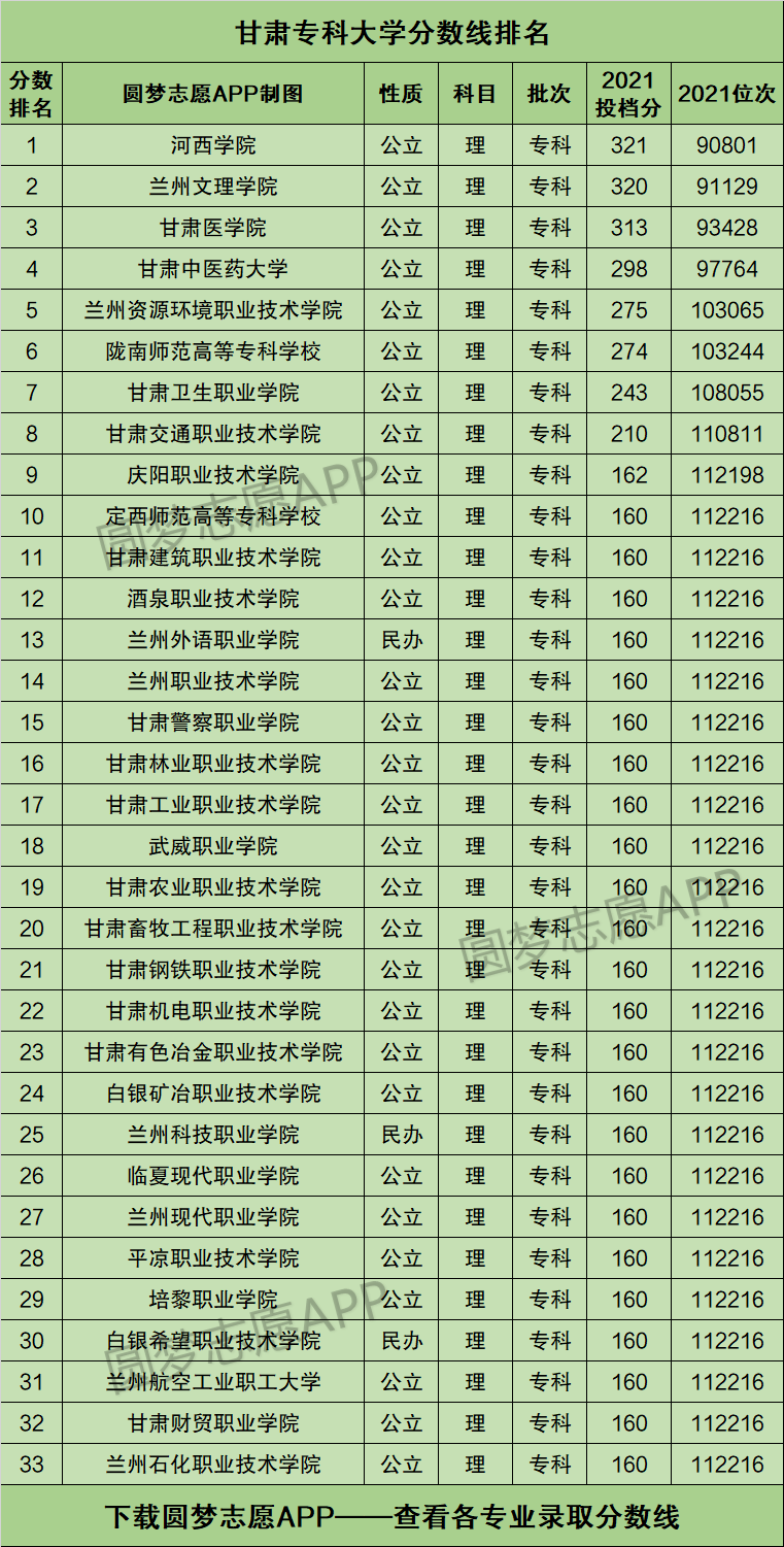 本文将为大家奉上甘肃省内所有的专科大学2021年的招生录取分数线排名汇总,供2022年甘肃省高考生查阅!