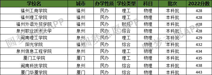 在福建省物理类中,分数线最低的学校均为民办大学,具体情况如下: