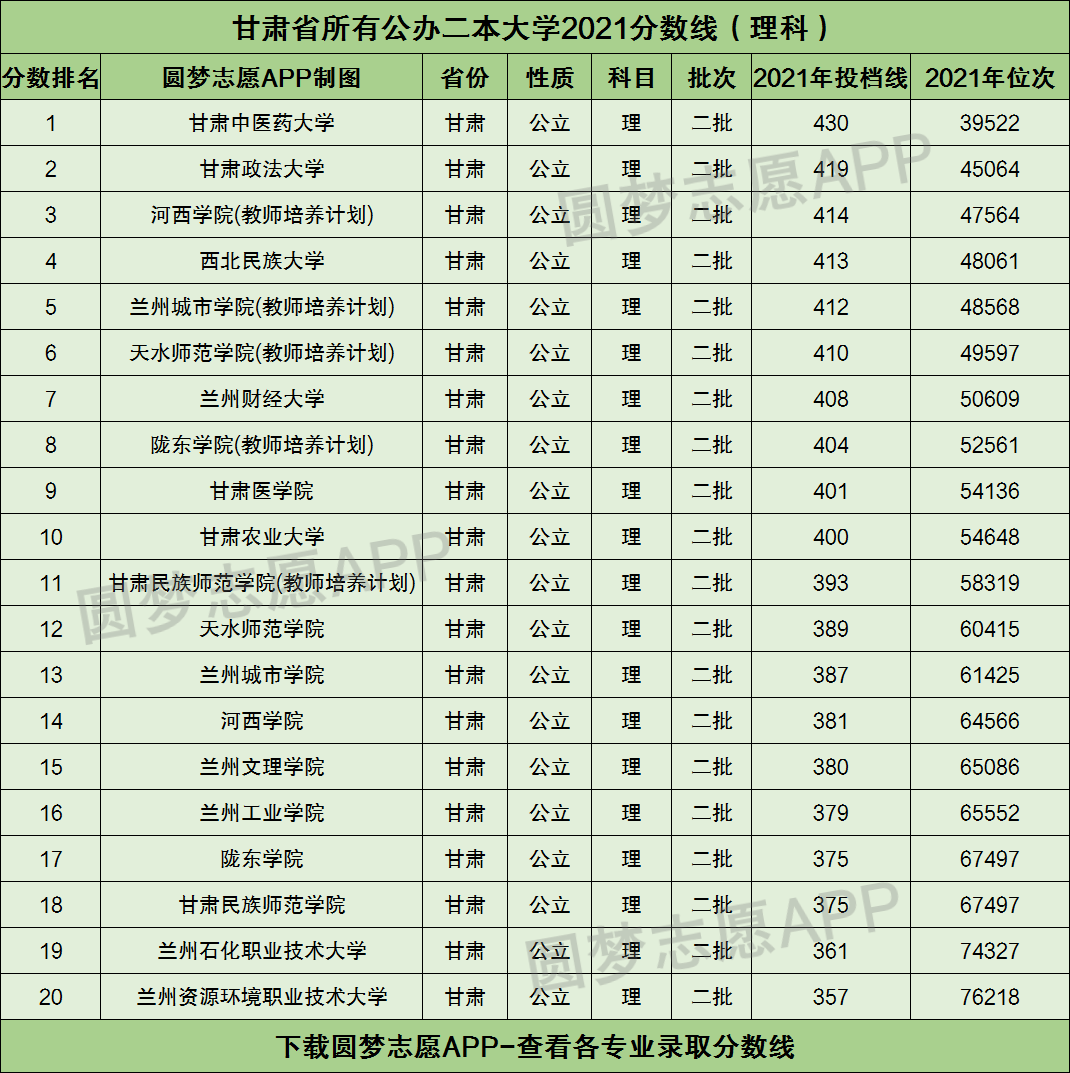 根据下图可知,甘肃省内的公办二本大学2021年在甘肃高考理科的最低分数线为357分,对应的大学为兰州资源环境职业技术大学。而甘肃省2021年高考理科二本线为336分,这也就意味着如果你想读甘肃省内的公立二本大学,那么至少得超过二本线21分才行!