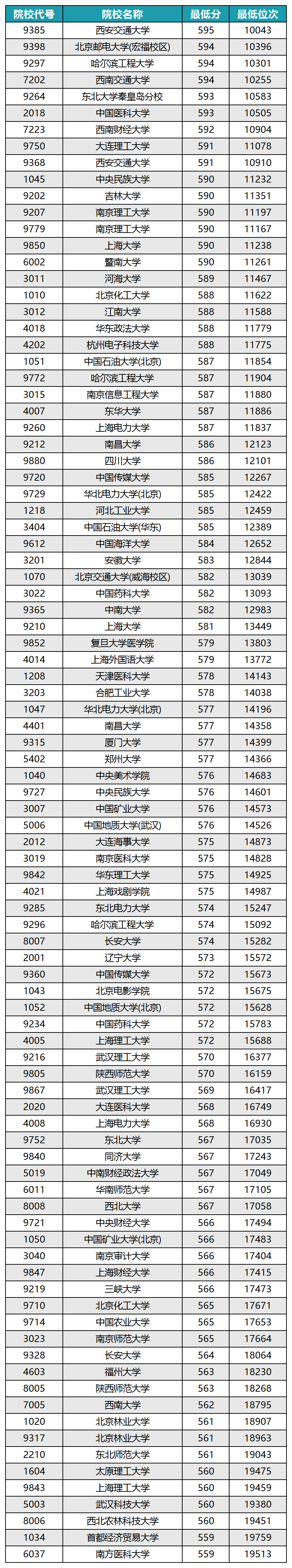 位次在1万多名的理科大学:西安交通大学(595分)、哈尔滨工程大学(594分)、西南交通大学(594分)、东北大学秦皇岛分校(593分)、西南财经大学(592分)、中央民族大学(590分)等。