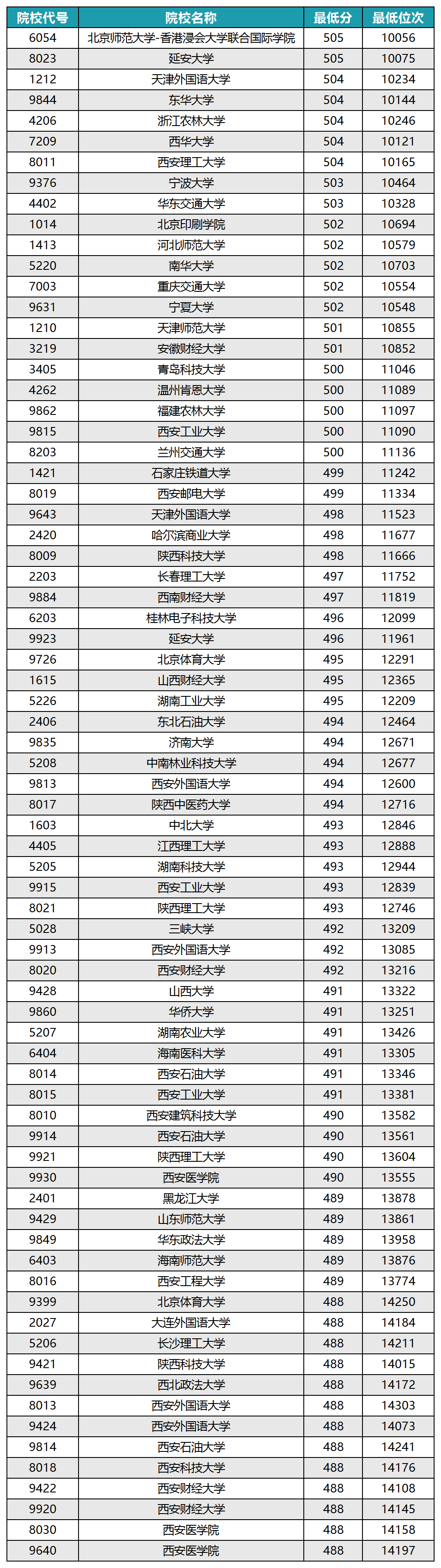 2024各大院校分数线已公布!在陕西录取位次为1万多名的文科大学有青海大学(506分)、首都经济贸易大学(505分)等;在陕西位次为1万多名的理科大学有吉林大学(590分)、东华大学(587分)等。