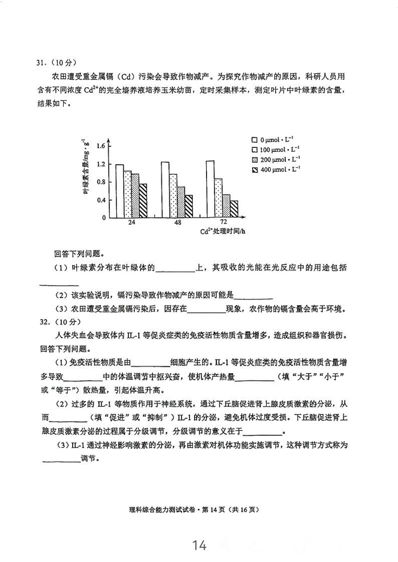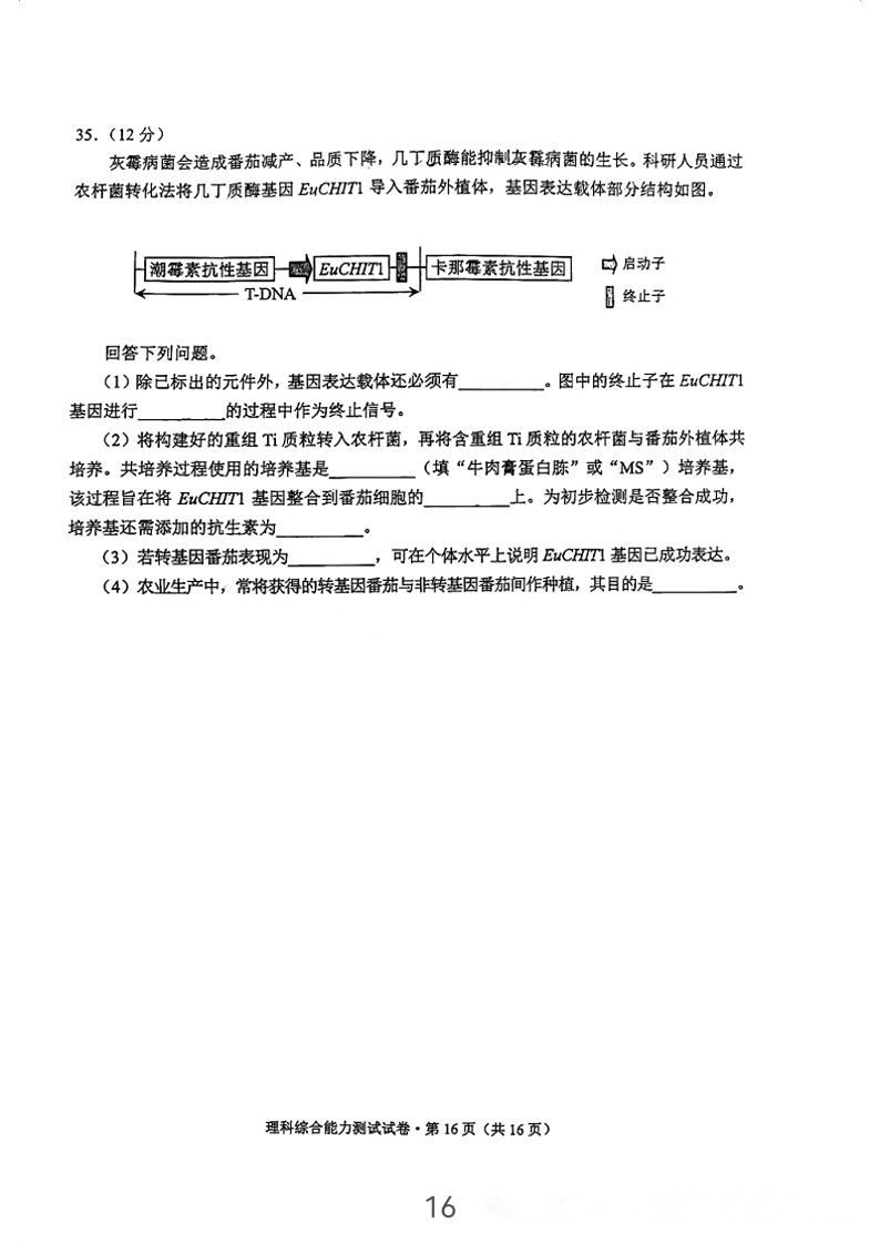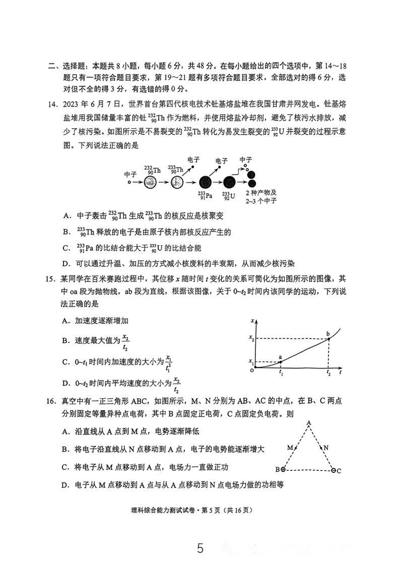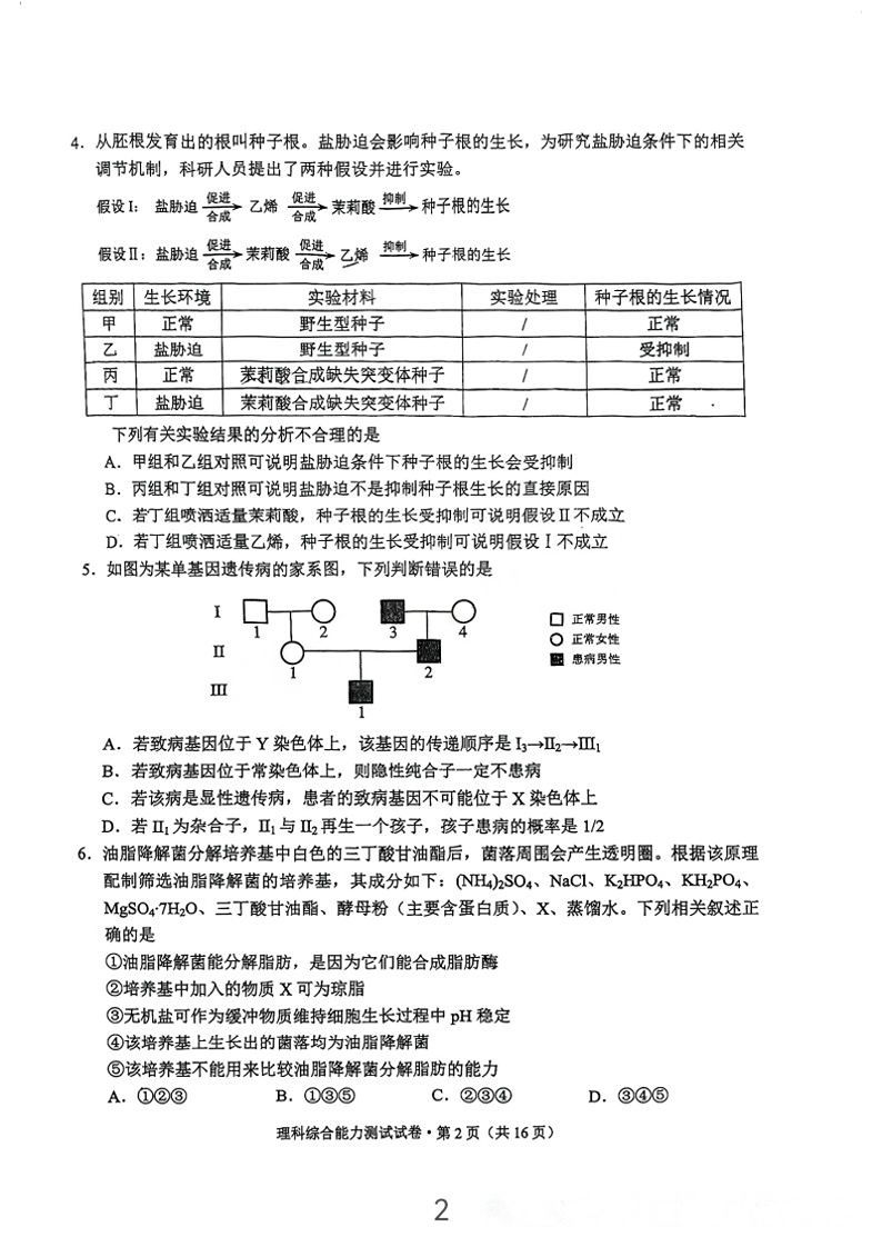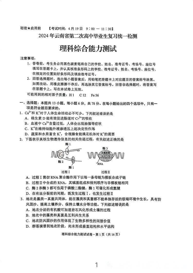 5.2024云南高三第二次统测理综试卷及答案解析