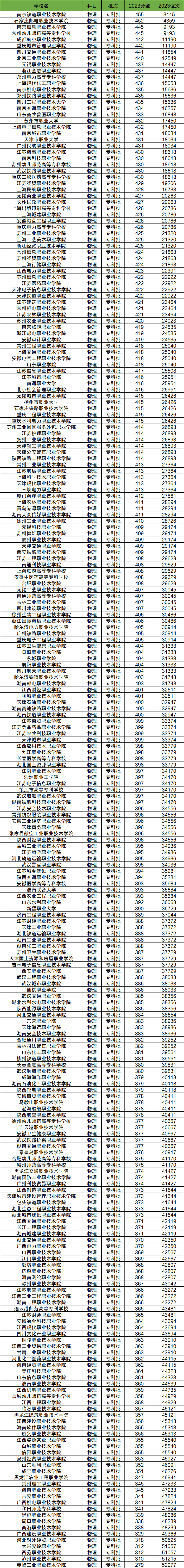 2023年在江苏物理类录取分数最低的公办专科大学是赤峰工业职业技术学院,对应江苏物理类全省排名第52977。下文将整理分数线最低的公办专科大学招录情况,来看看全国公办专科大学在江苏省录取分数线是多少吧!