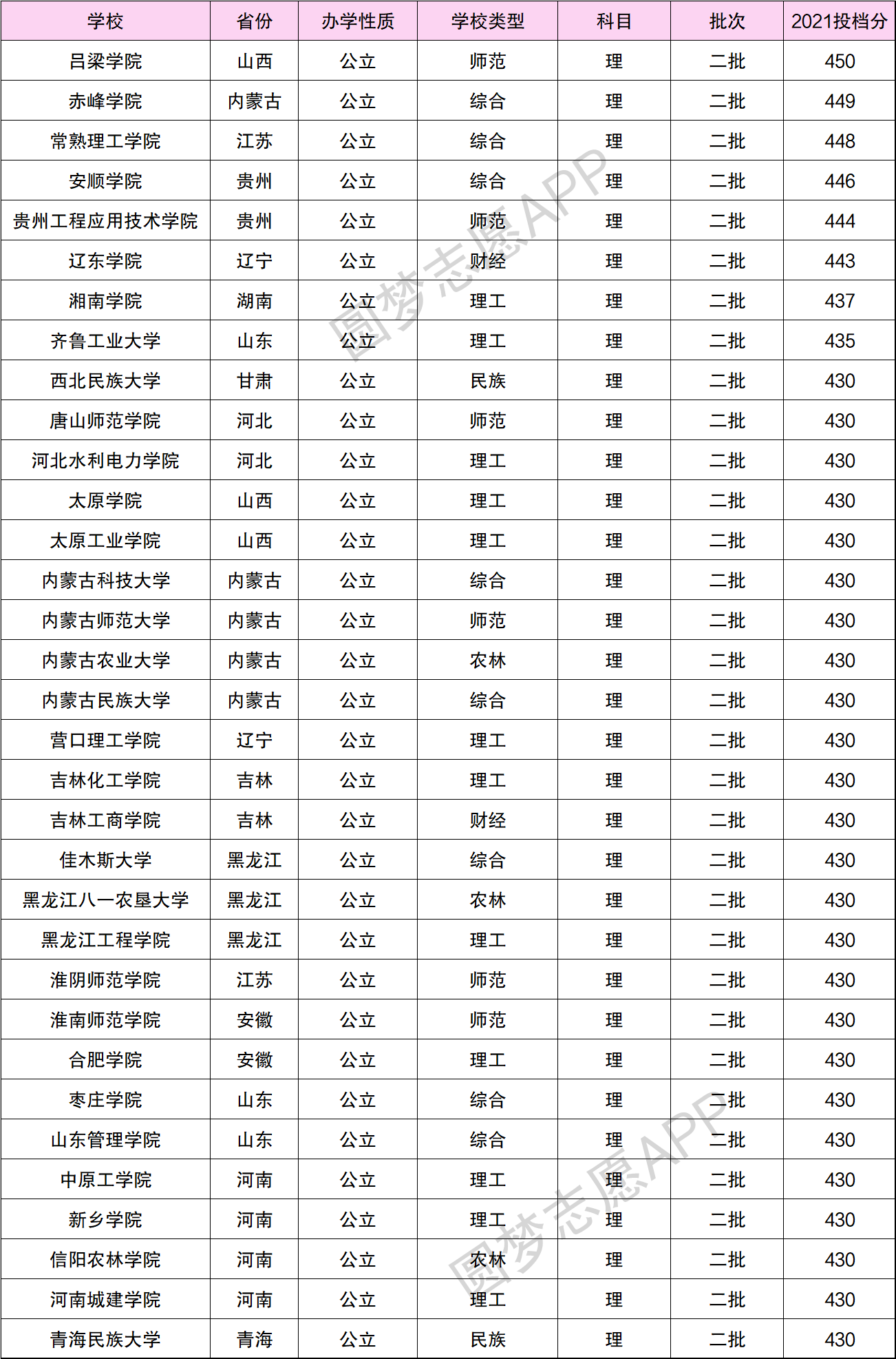 根据各大高校2021年在四川省的理科投档线,老师整理了全国分数线最低的公办二本大学名单。2021年四川省的理科最低分是430分,下表中的大学比批次线仅高出20分以内,是很容易考上的公办二本大学。