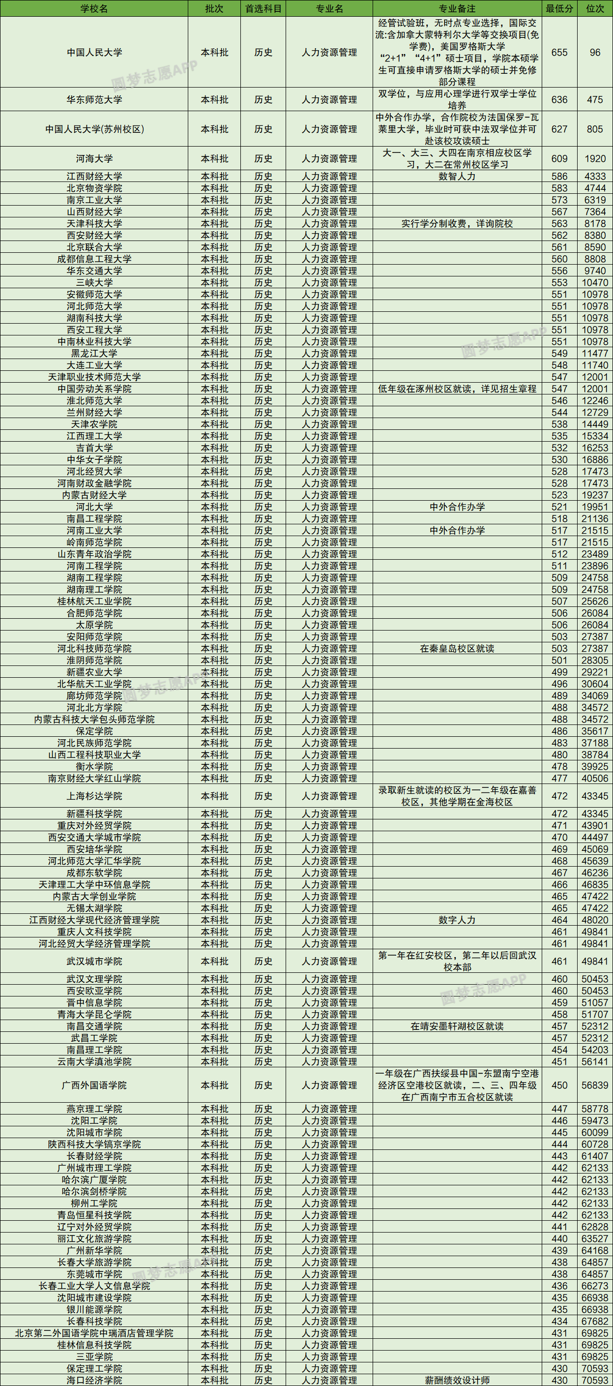 全国大学在人力资源管理专业上,招收历史类考生有103所大学,其中分数最高为655分的中国人民大学,分数最低为430分的海口经济学院。