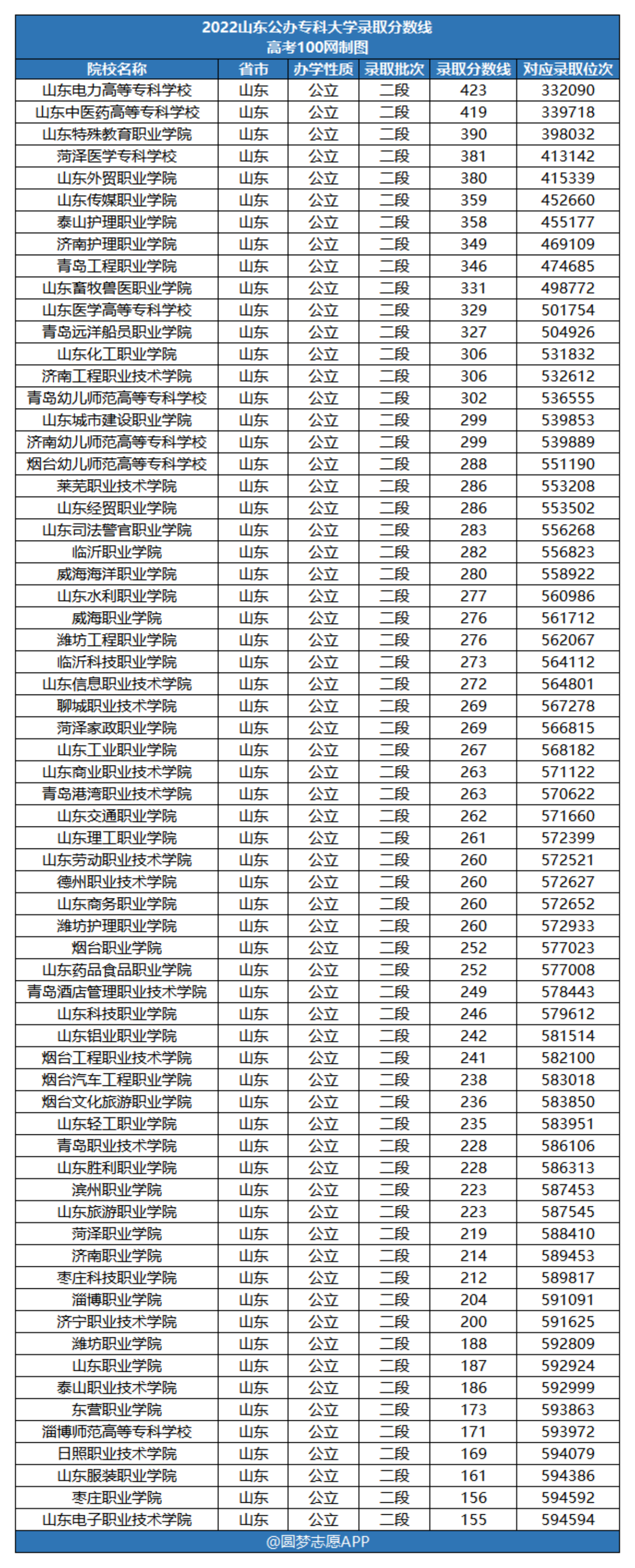 2022年山东公办专科学校排名及录取分数线一览表如下,排名为分数从高到低: