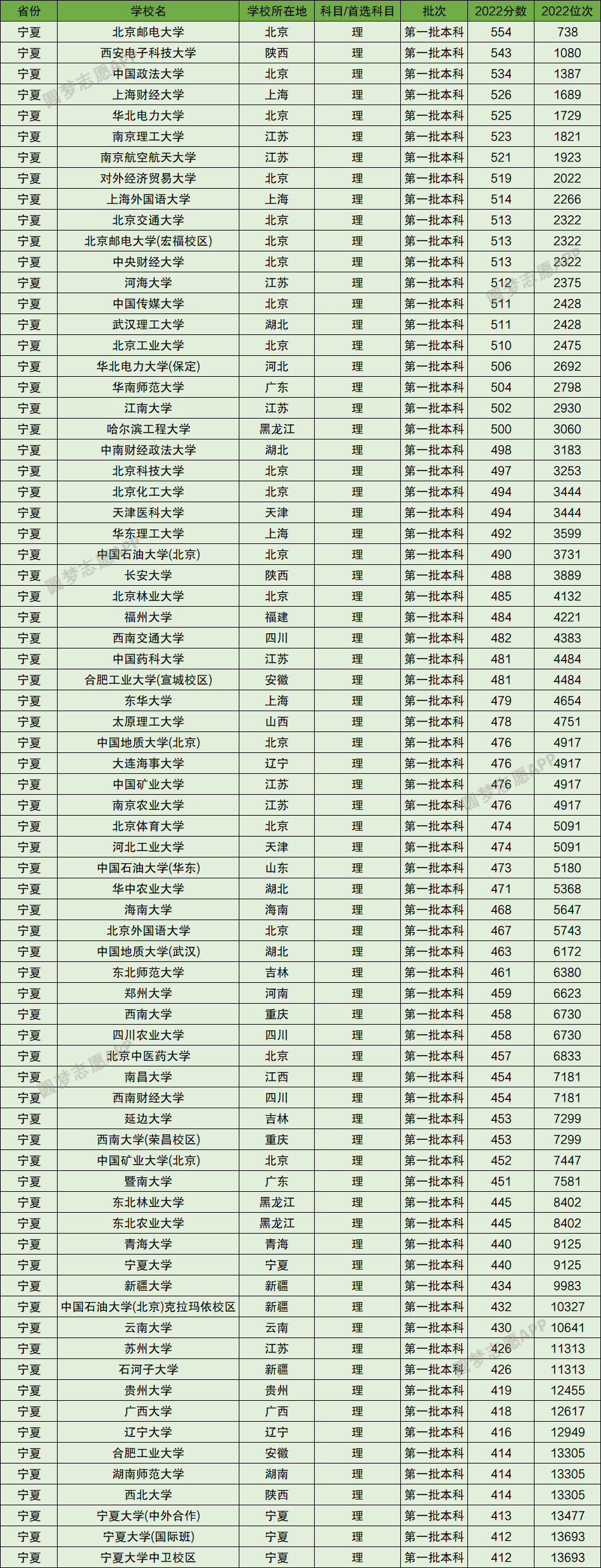 理科收分最低的是宁夏大学中卫校区,其2022年最低分为412分(超宁夏理科二本线62分),录取位次为13693位。