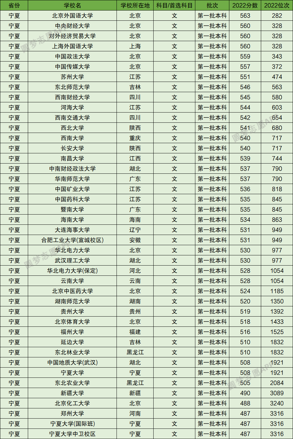 文科收分最低的是宁夏大学中卫校区,其2022年最低分为487分(超宁夏文科二本线62分),录取位次为3316位。