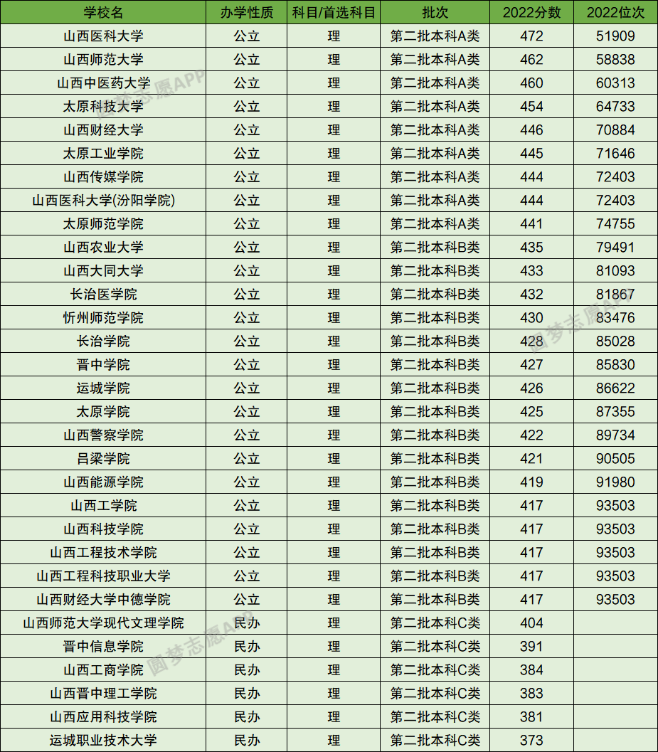 理科收分最低的是运城职业技术大学,其2022年最低分为373分(超山西理科二本线-44分)。