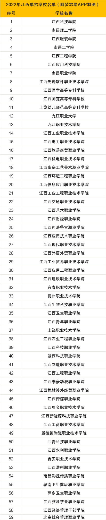 2022年江西省单招学校共计59所,其中本科院校6所,专科院校53所。