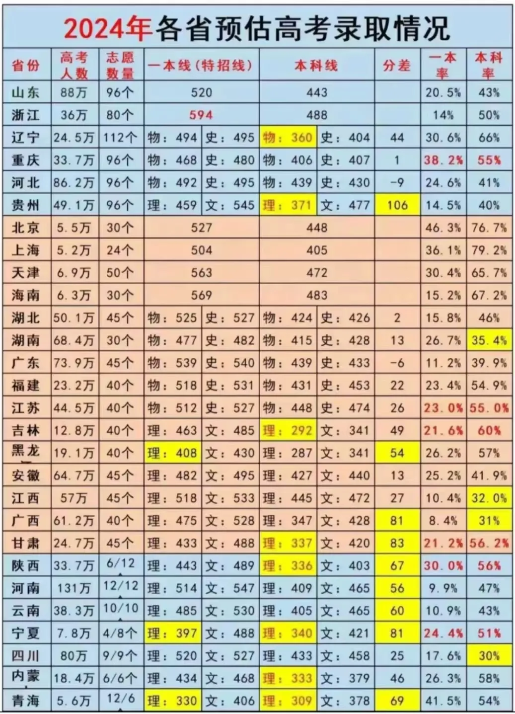 特别说明:以上数据均为2024高考预测分数线,由各地网友或老师预测,仅供家长和考生参考,不具有实际指导意义。具体以各省考试院公布的为准!