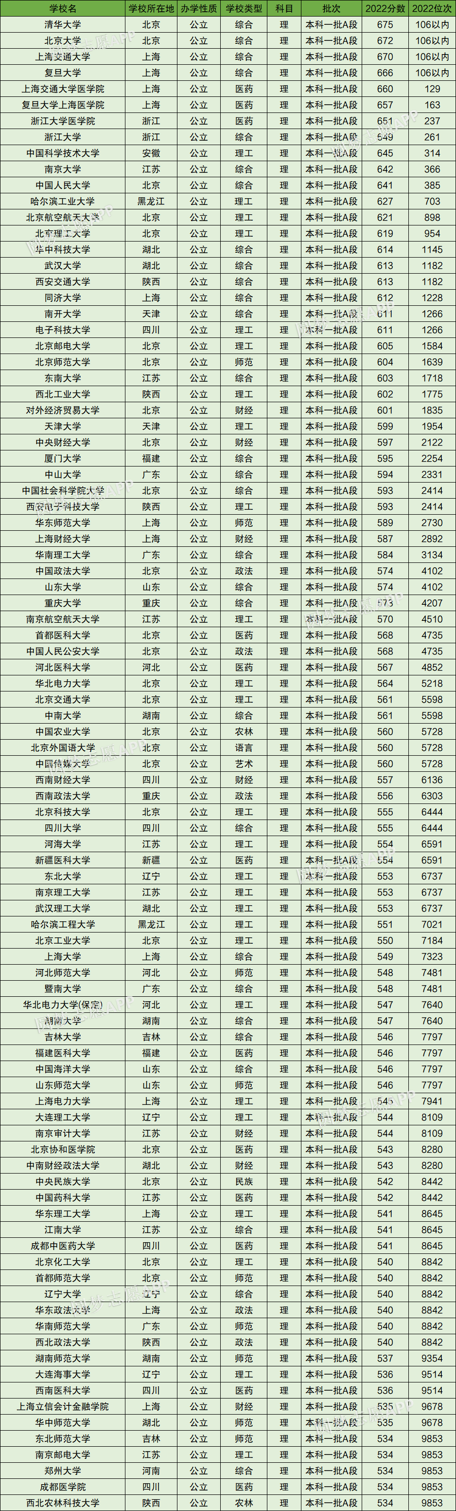 根据国内各大学在吉林省理科的招录数据可知,2022年吉林省高考成绩在1万名之前的理科考生能上的学校有93所,对应的分数为675分~534分。
