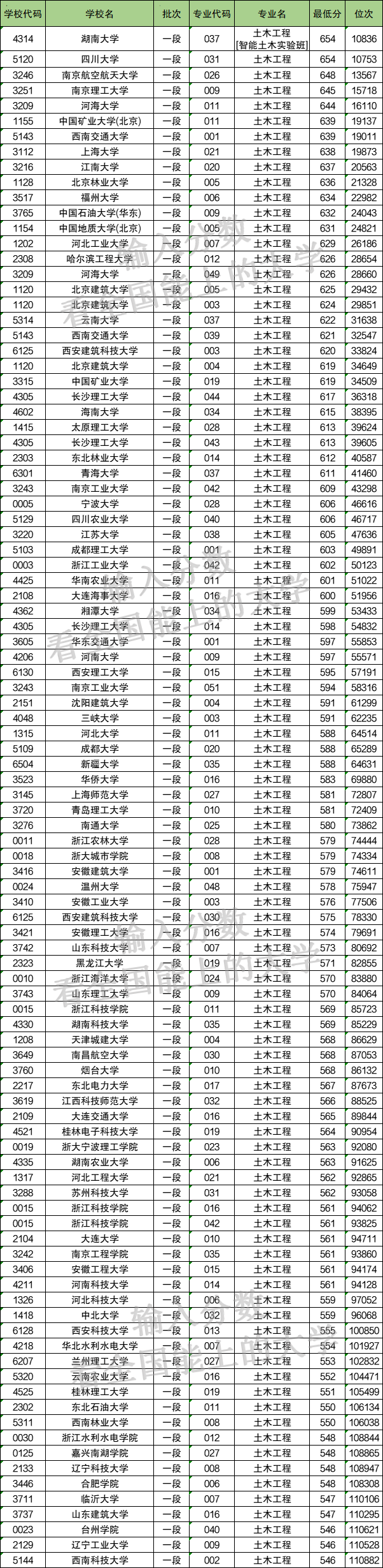 各大学的土木工程专业分数分布在488-654分之间,全省位次175424-10753之间。