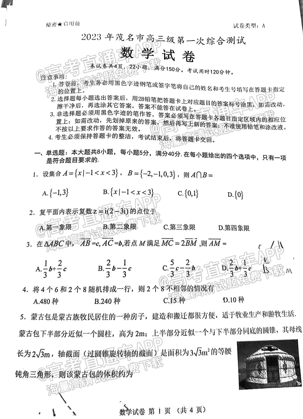 2023茂名一模主要考语文、数学、英语、物理、化学、生物、政治、历史、地理等9门科目,以下是各科的试卷及答案解析,可供参考: