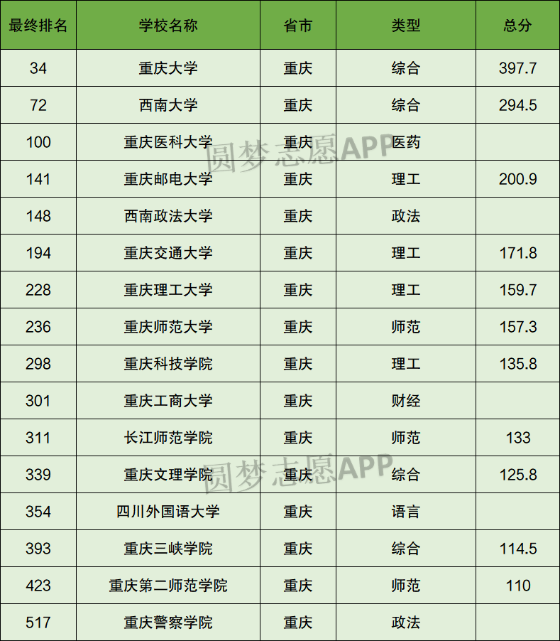 如果某所重庆大学的排名很好但分数不高,说明这所重庆大学实力好分数低,很有性价比。如果某所重庆大学分数高,排名相对逊色,说明这所重庆大学认可度不错。