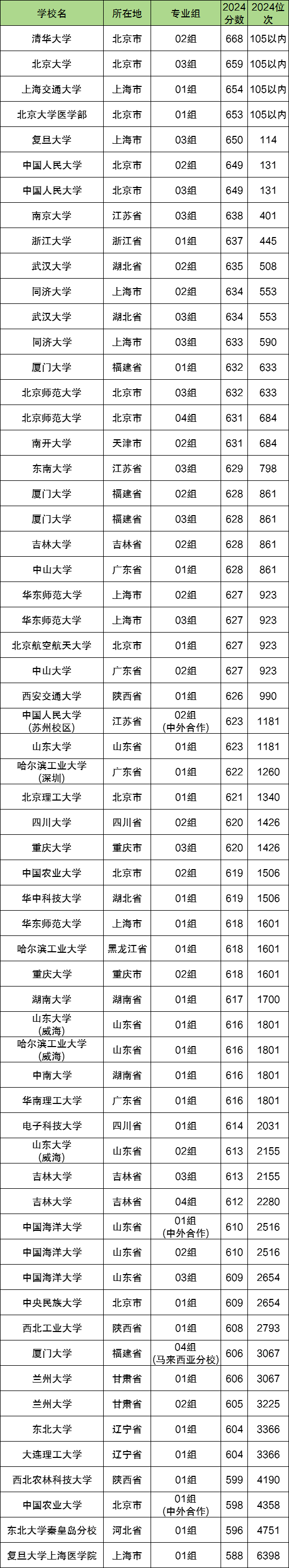 历史录取分数线最低,最好考的985大学:复旦大学上海医学院01组,2024年最低分588分,最低位次在6398名;其次是东北大学秦皇岛分校01组,最低分都在596分,最低位次在4751名。