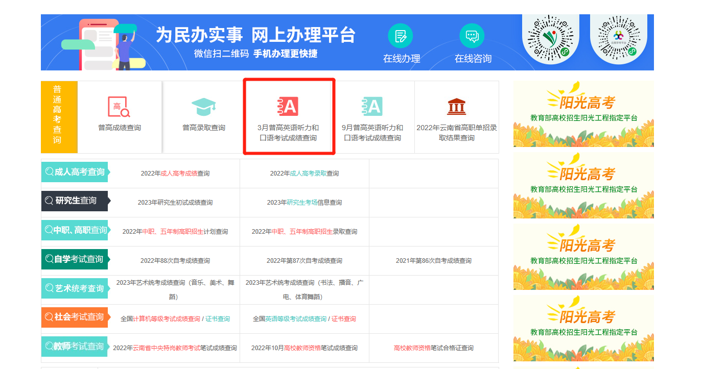 1. 同学们进入云南招生考试院(云南省招考频道 (ynzs.cn))的首页后,下滑至底部,可以看到普通高考查询框,其中有一个“3月普高英语听力和口语考试成绩查询”,点击进入即可。