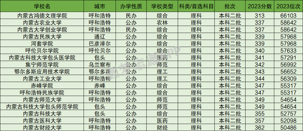 内蒙古鸿德文理学院(313分)、内蒙古农业大学(337分)、内蒙古大学创业学院(337分)、内蒙古民族大学(339分)、河套学院(339分)、呼伦贝尔学院(340分)、内蒙古科技大学包头医学院(341分)、集宁师范学院(342分)、鄂尔多斯应用技术学院(343分)、内蒙古工业大学(344分),以下为2023年内蒙古自治区理科所有二本大学分数线。