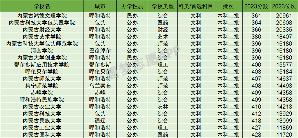 内蒙古鸿德文理学院(361分)、内蒙古科技大学包头医学院(364分)、内蒙古财经大学(366分)、内蒙古艺术学院(380分)、内蒙古科技大学包头师范学院(396分)、河套学院(396分)、内蒙古大学创业学院(396分)、鄂尔多斯应用技术学院(400分)、呼伦贝尔学院(403分)、内蒙古师范大学(407分),以下为2023年内蒙古自治区文科所有二本大学分数线。