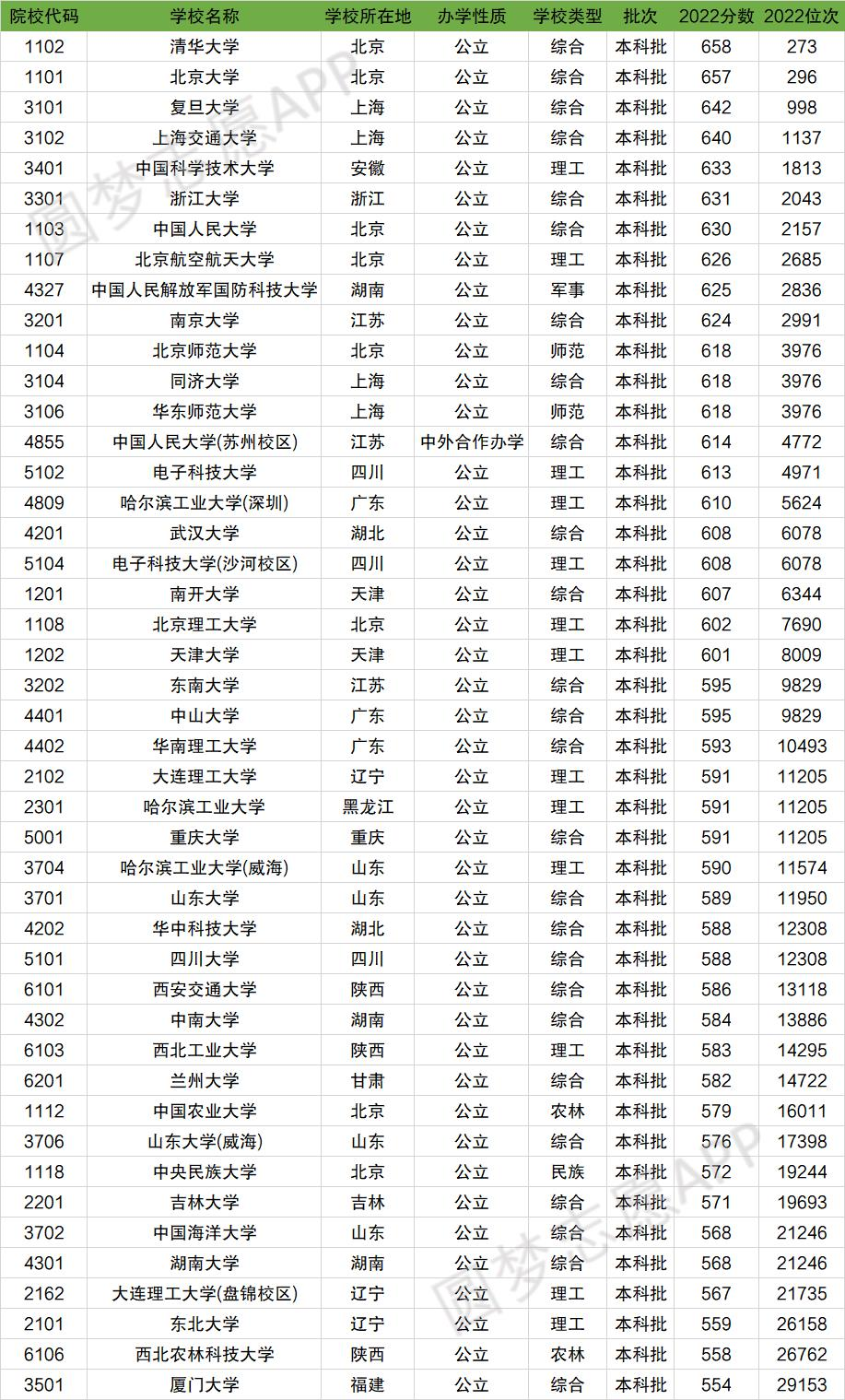 2、在湖南省,分数最低分为554分的厦门大学、558分的西北农林科技大学、559分的东北大学。