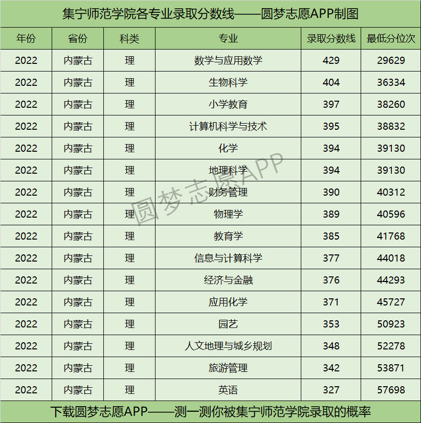 综上可知,集宁师范学院2022年在内蒙古理科招普通类考生时,收分最低的为英语专业,其对应的最低分为327分,只要考进了内蒙古理科前57698名,就有机会被录取。