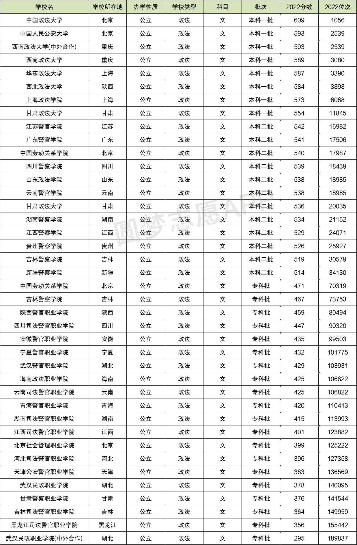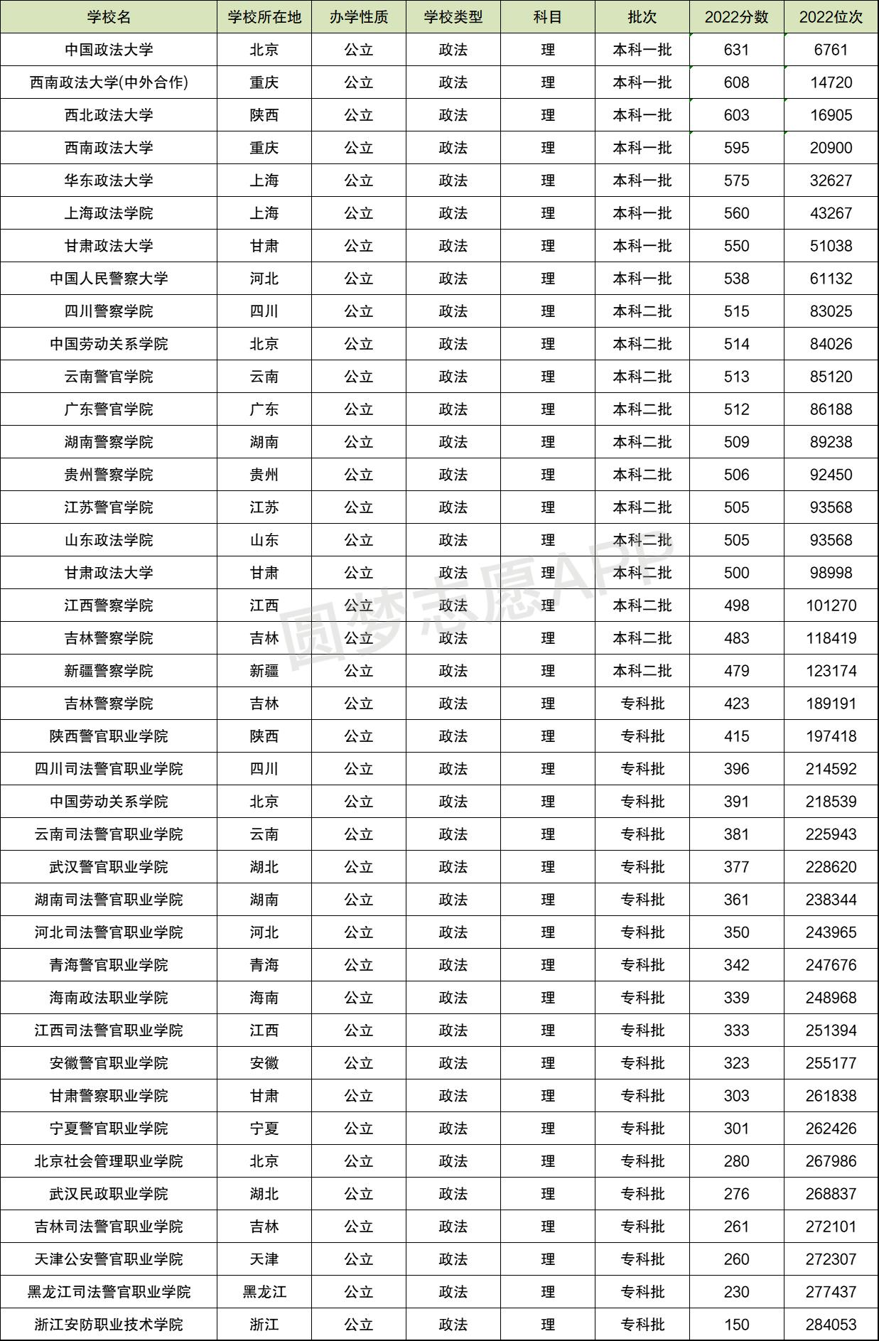 2022年全国政法大学录取分数线排行榜一览表