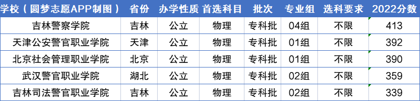 在物理专科中,分数最高、最难考的大学是吉林警察学院413分;分数最低、最好考的大学是吉林司法警官职业学院339分。