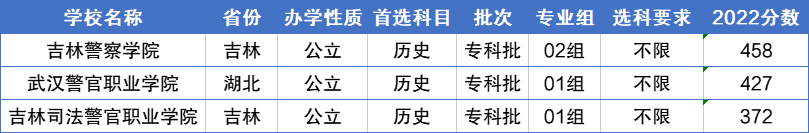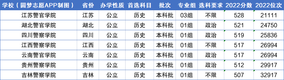 在历史本科中,分数最好、最难考的警校是江苏警官学院528分,所在位次是21111;分数最低、最好考的大学是吉林警察学院507分,所在位次是32917。
