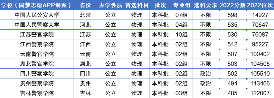 在物理本科中,分数最高、最难考的警校是中国人民公安大学598分、所在位次14927;分数最低、最好考的大学是吉林警察学院485分,所在位次是122007。