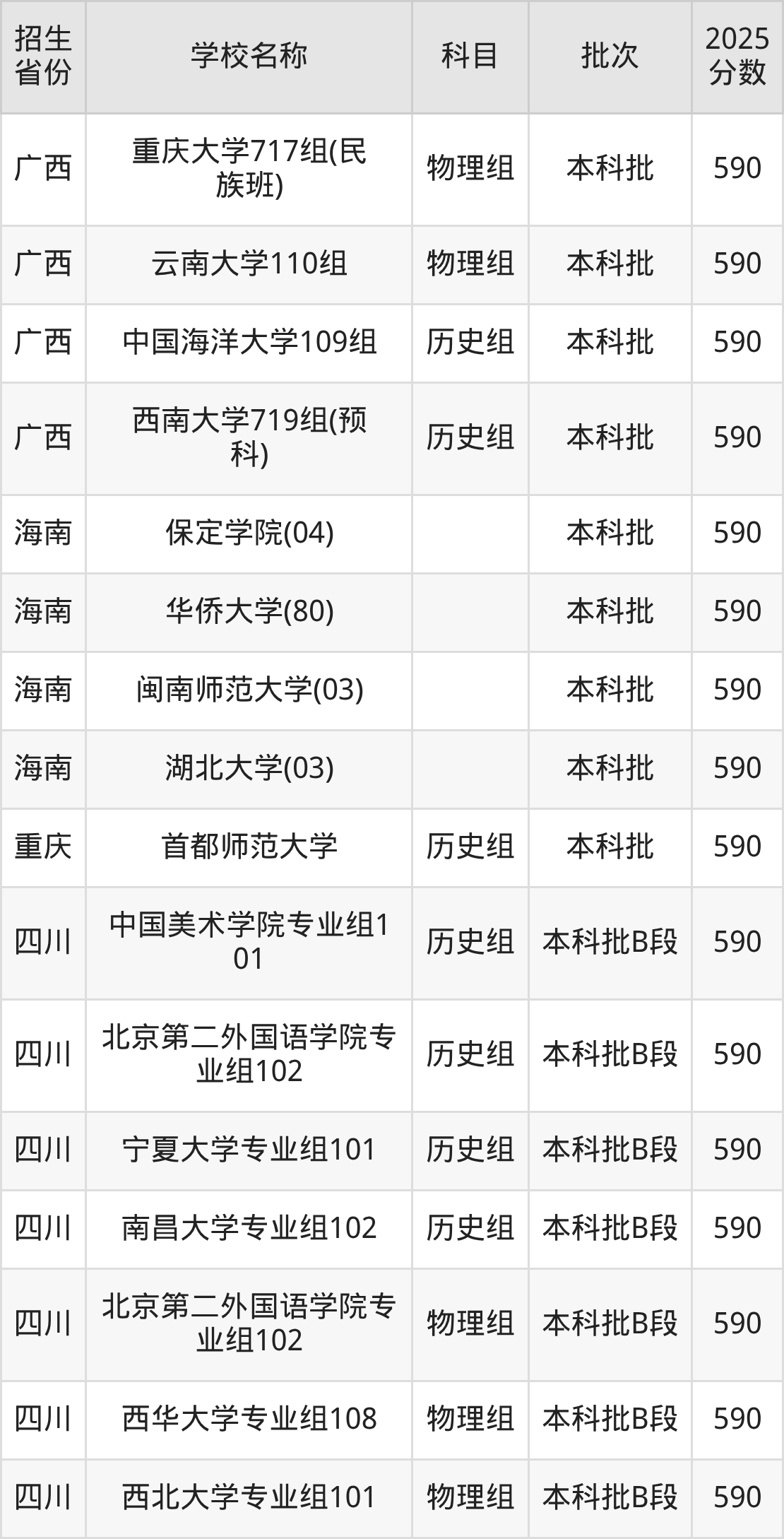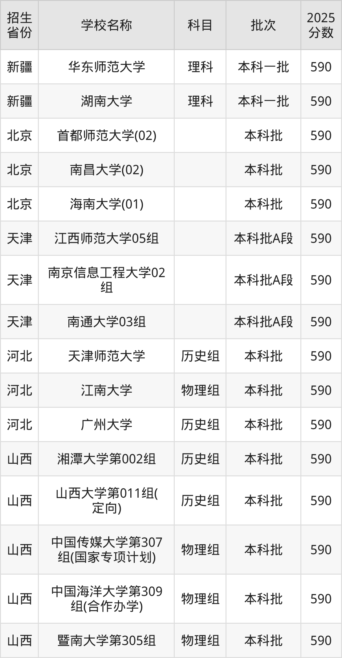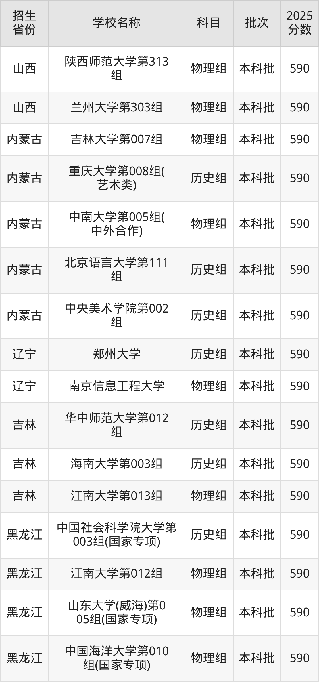 筛选全国各省2025年录取分数线为590分的文科大学如下: