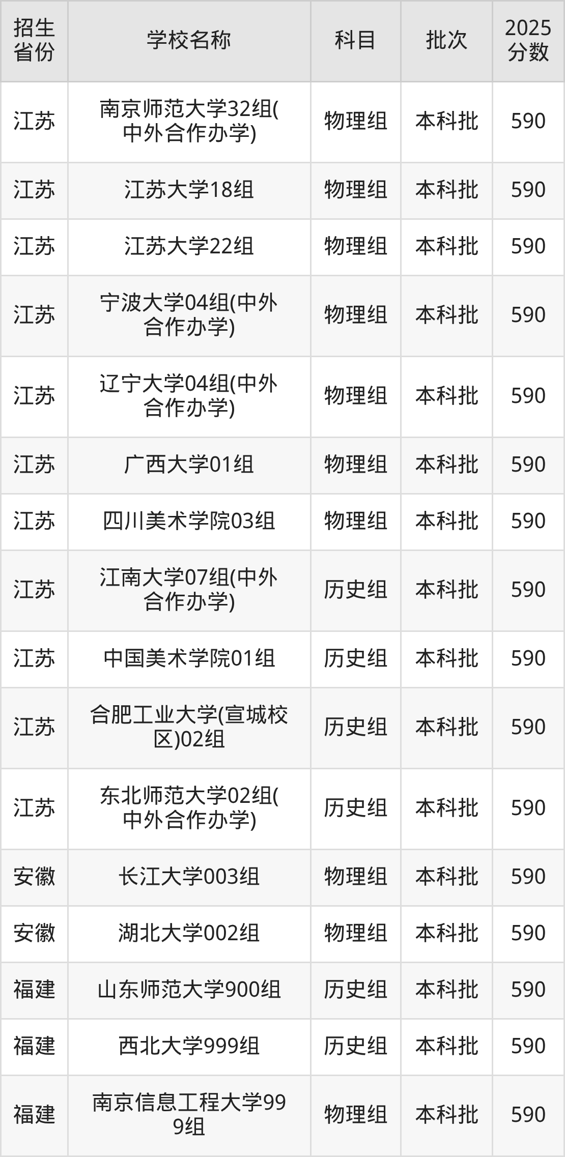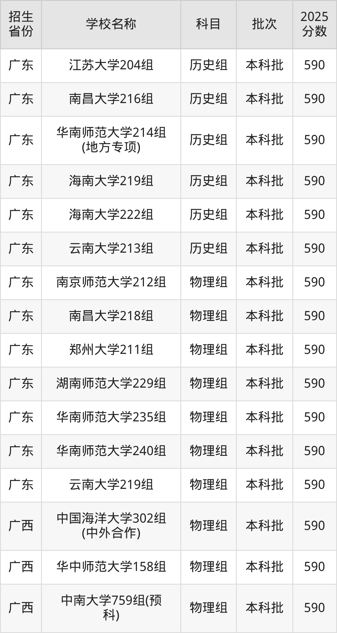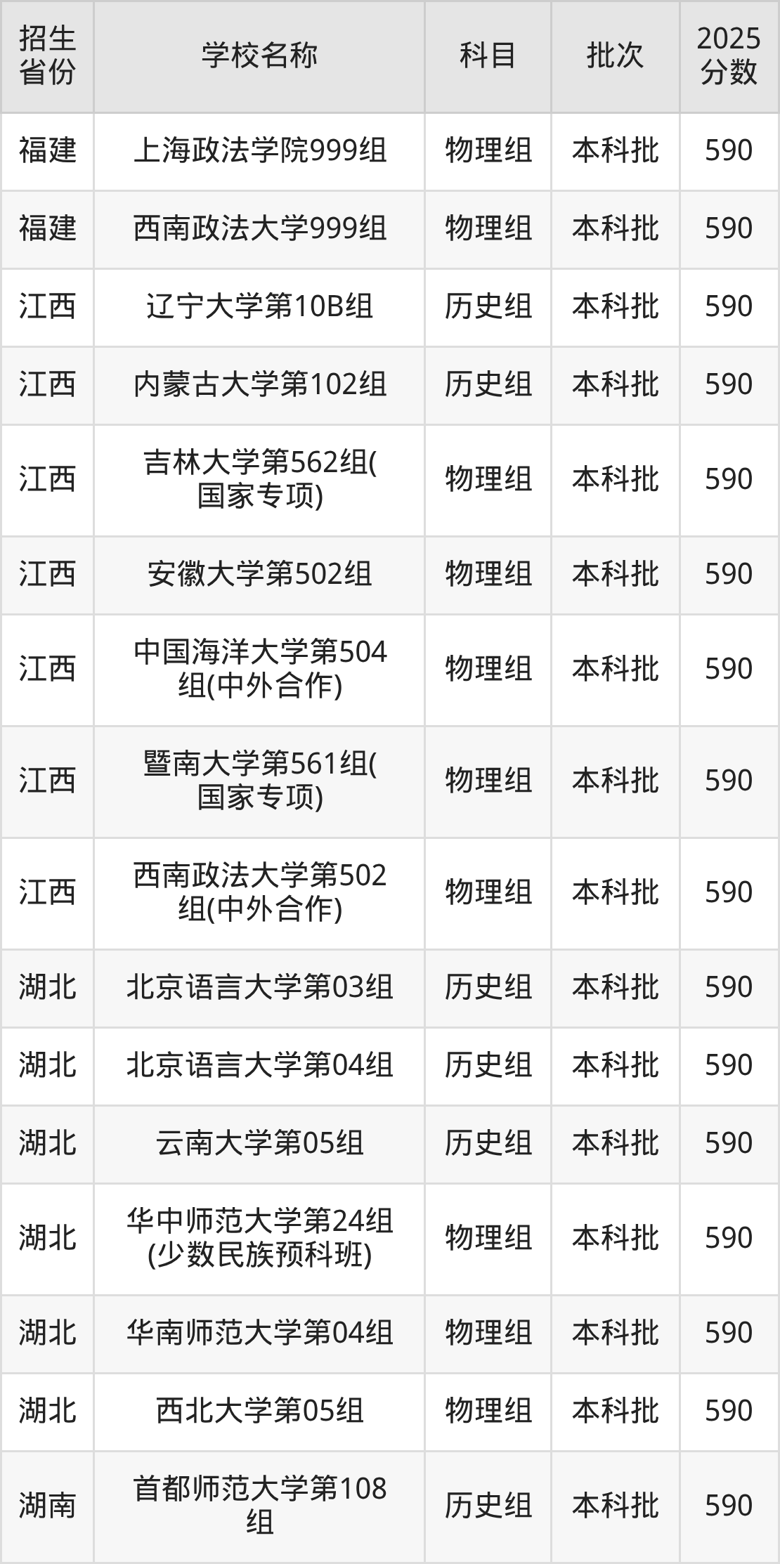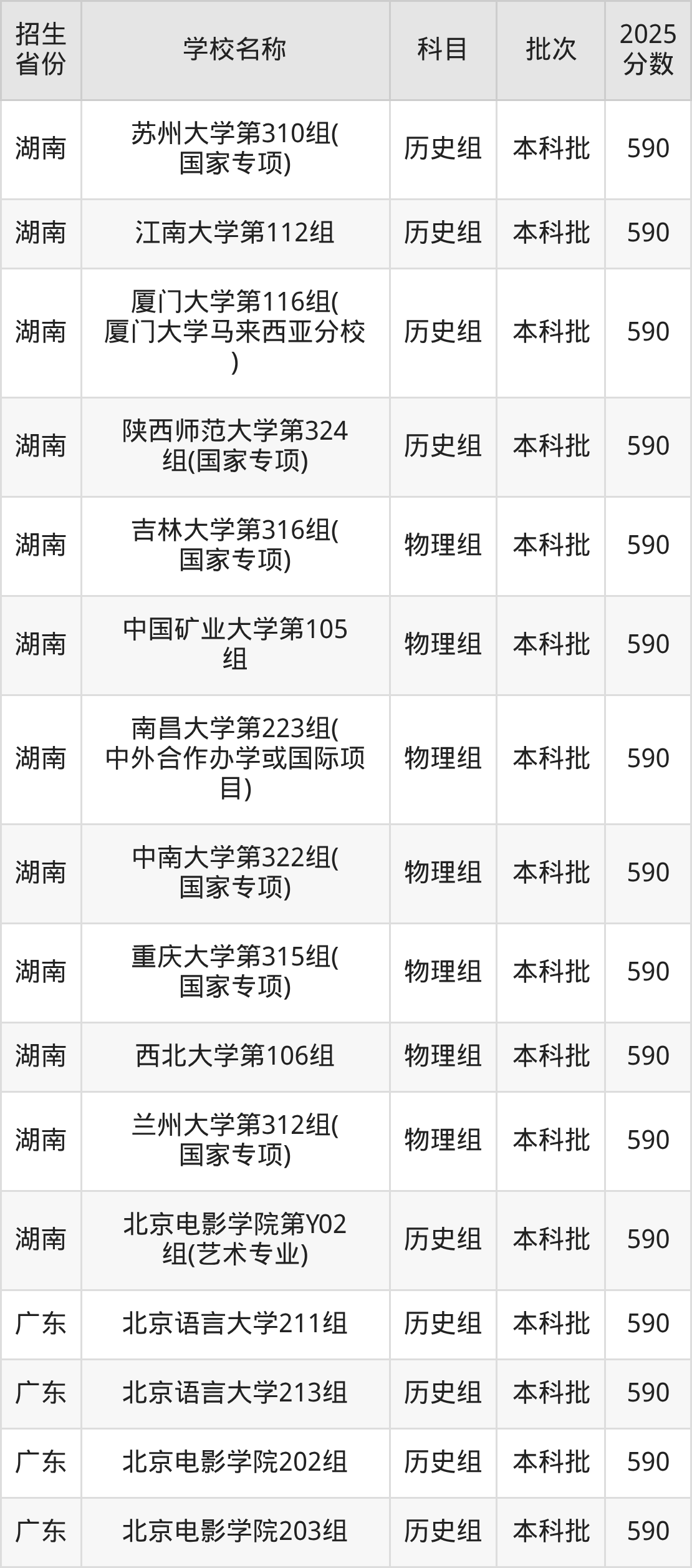 筛选全国各省2025年录取分数线为590分的文科大学如下: