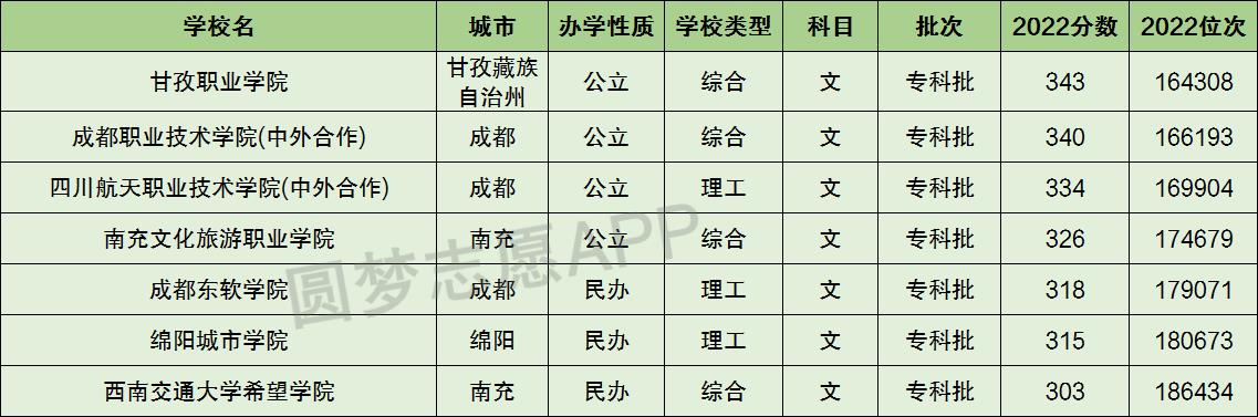 以下为2022年高考中四川省内300到350分的大学名单,二本大学有成都东软学院、绵阳城市学院、西南交通大学希望学院,其余的为专科学校。