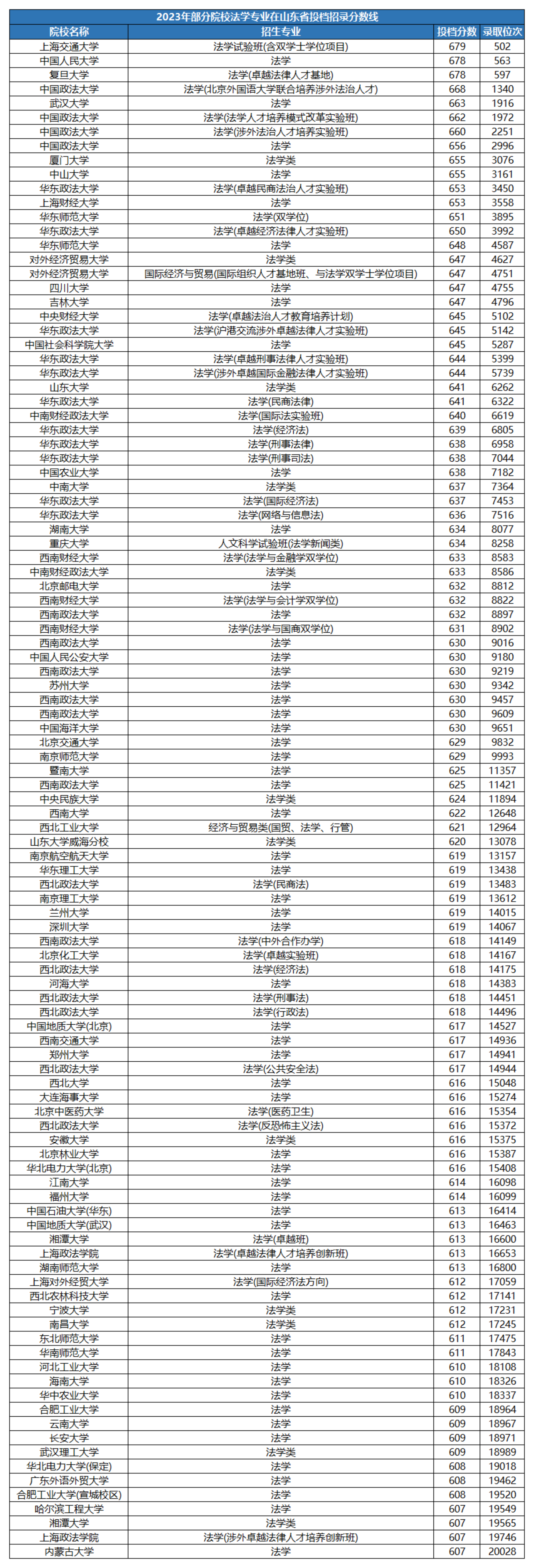 以今年全国大学在山东高考招录情况为例,2023年招生专业为法学,在山东录取分数最高的大学是上海交通大学,对应录取专业为双学士学位项目的法学试验班,投档分数高达679分,对应录取位次为全省502名。