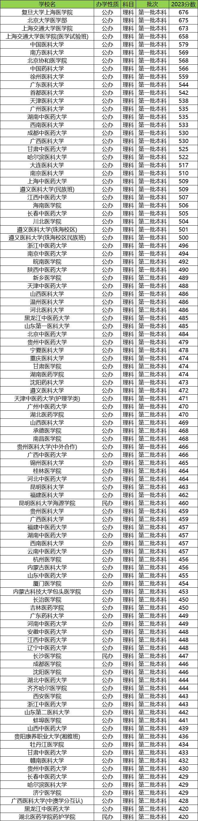 一本医科大学中贵州医科大学分数最低,459分以上就有机会,二本医科大学中新疆医科大学最容易考上,最低只要372分。