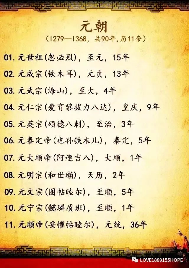 元朝:公元1271年—1368年,元太祖孛儿只斤·铁木真,共计:89年。