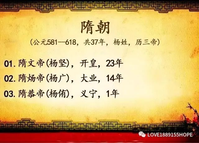 隋朝:公元581-公元619年,隋文帝杨坚,共计:39年。