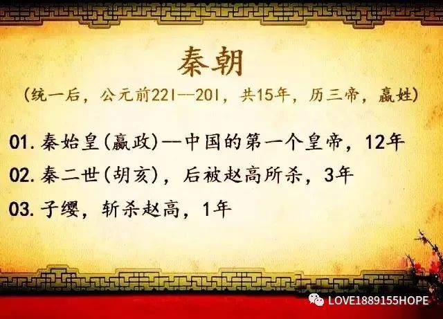 秦朝:公元前221-公元前206年,前221年秦王嬴政统一六国,首称皇帝,共计:16年。